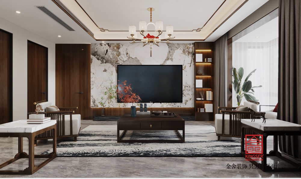 主人喜喝茶、對影音方面有需求、社交圈廣、對客餐廳和廚房要求極高,設計師進行了適當的墻體拆除,利用梁去做造型,去強化、體現空間感??蛷d利用柱子做了一個東西向的書柜,具備一定的空間實用性。加入透光玻璃使其增加采光面,把人造光打造成自然光的感覺,以達到光的營造目的。電視墻的處理手法是把實墻的底部設計懸空感,讓實墻變成裝置、底部下面放石頭,石頭與不銹鋼飾面和反弧度造型有很好的銜接。頂面直接用雙層弧面頂、上下弧形完美銜接,給人一種輕盈感。投影與書房的銜接,燈光是周圈燈光,光感也會框定化、面也會最大化,形成等面。留白不空,留白不白,濃淡得宜,猶如山水畫般更能予人無限想象的空間。廚房整體的構造是開放式設計,不僅具有較強的流動性和自由性,同時有保持空間的功能合理性打造更加人性化的烹飪環境。臥室是人在家中憩息的港灣,倦鳥歸,整體營造的沉穩、安靜、高端的風,使視覺以及精神感知方面得到雙重享受。