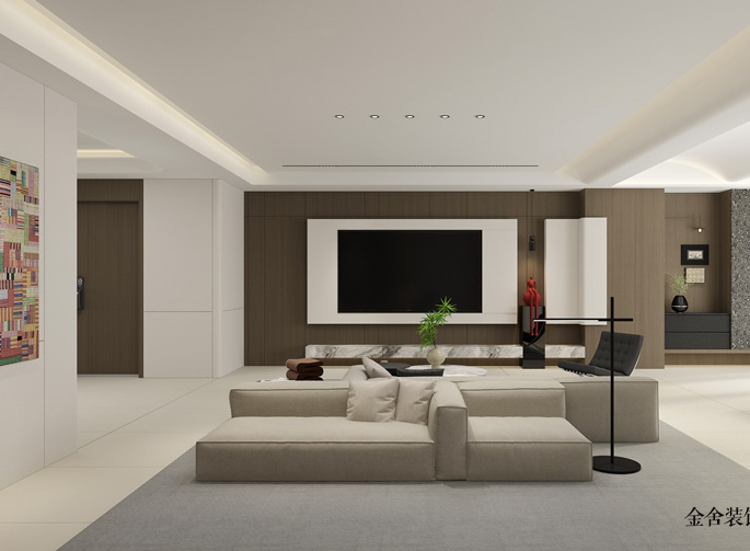 材質上,木質墻面傳遞自然溫潤,大理石元素增添精致感,不同材質的碰撞讓層次更豐富。布局上,寬大的米色組合沙發成為空間核心,圍繞電視背景墻,構建出舒適的社交與休憩場域,背景墻簡約大氣,與整體風格相得益彰。
