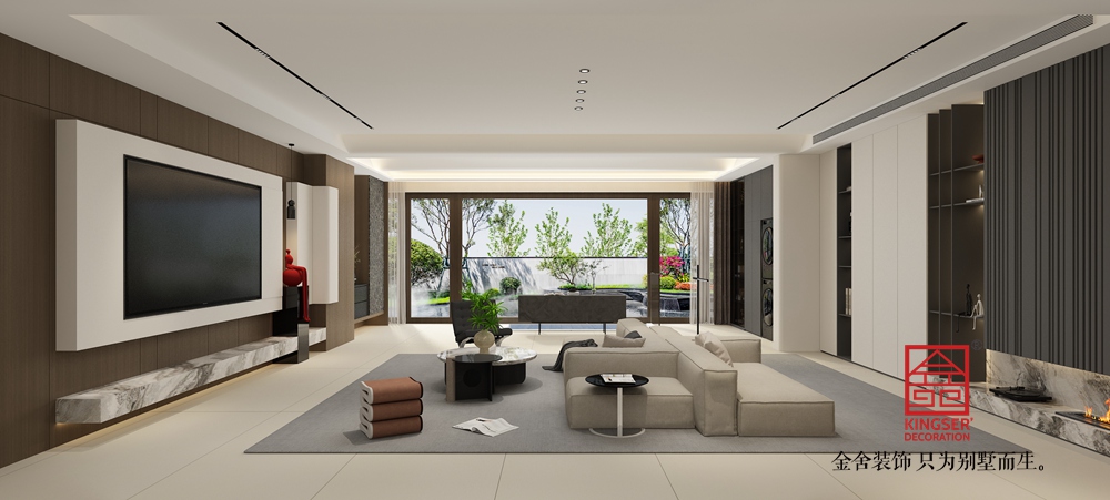 該客廳設計以現代簡約為基調,巧妙融合質感與美學??臻g以柔和的米白、淺棕為主色調,搭配灰色地毯,營造出靜謐優雅的氛圍。