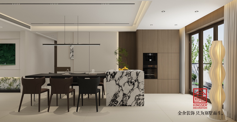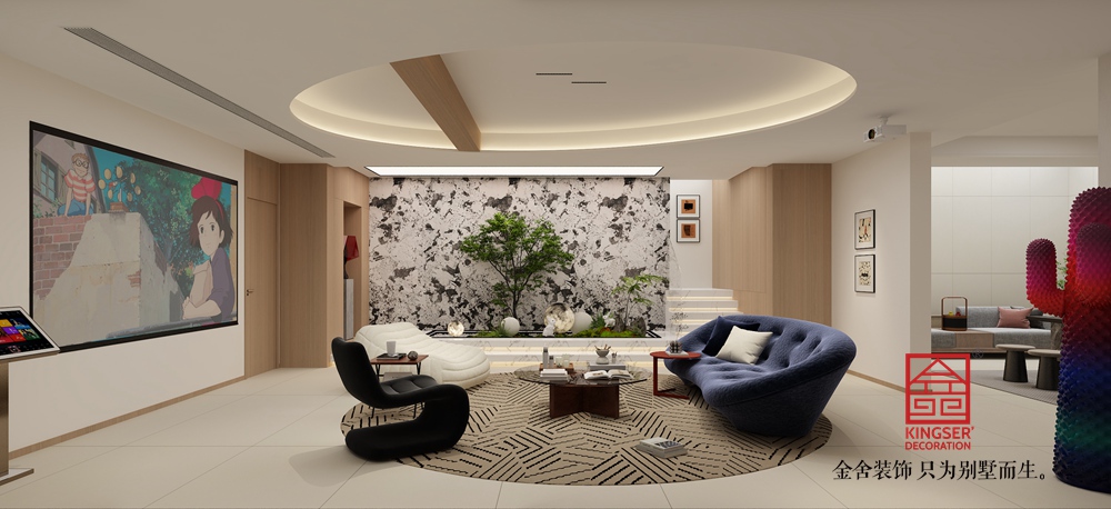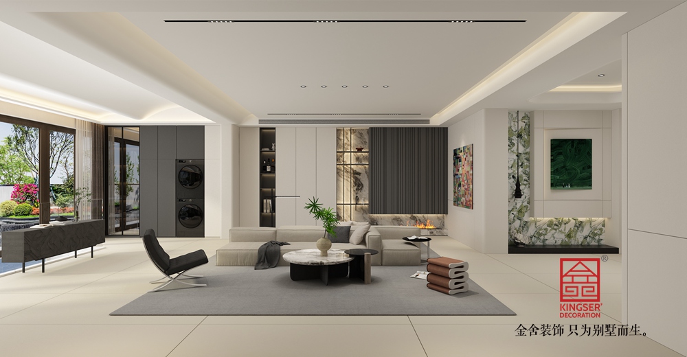 裝飾上,左側色彩絢麗的藝術畫作,為空間注入藝術活力;綠植與特色擺件的點綴,讓空間更顯生機與個性。充足的自然采光透過大窗涌入,結合精心設計的室內照明,使空間明亮通透。整體設計簡約卻不失格調,每一處細節都彰顯出對高品質別墅生活的用心營造。
