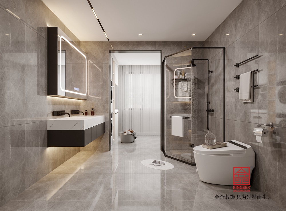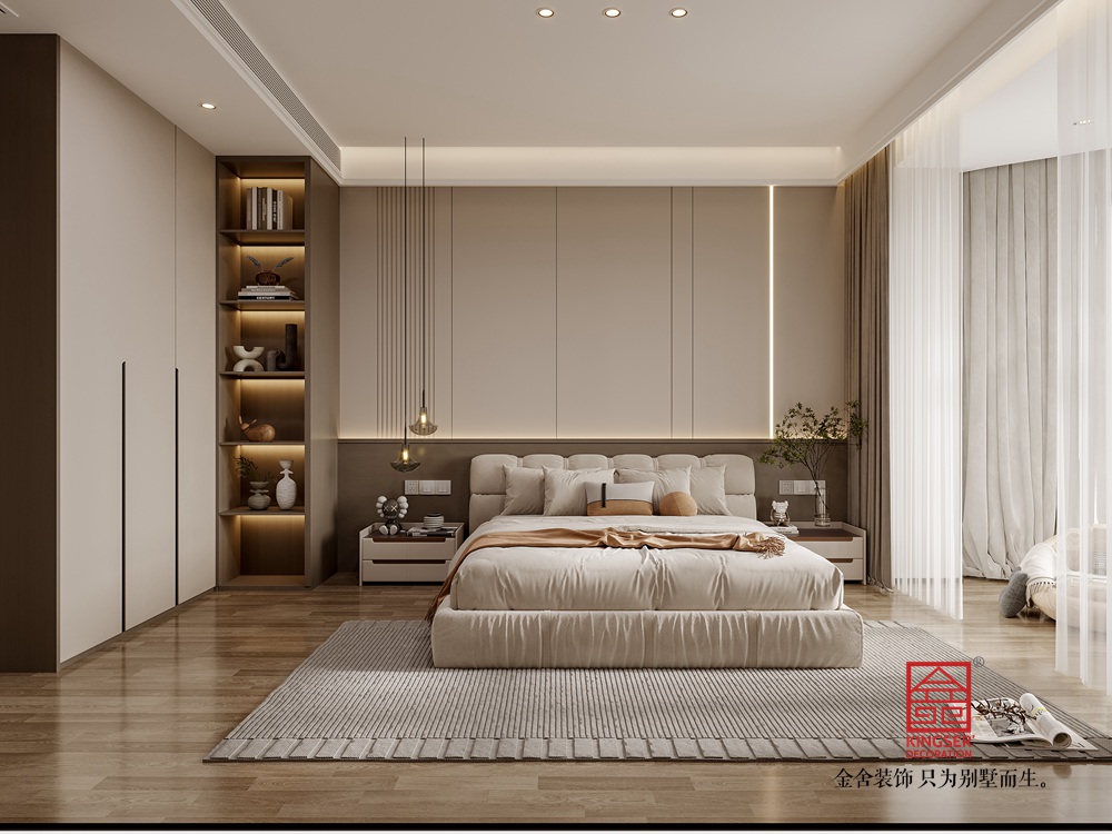 該別墅客廳設計遵循現代輕奢與極簡融合的思路。整體色調選取低飽和度的暖棕、米白等,構建出雅致柔和的基底。大面積的墻面采用簡潔的板材設計,干凈利落,與嵌入其中的電視及兩側帶有燈光點綴的收納格相配合,既滿足實用需求,又通過光影變化營造出輕奢氛圍。