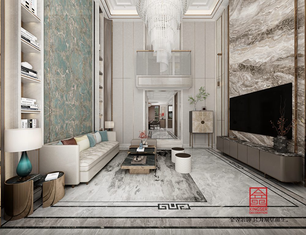 設計說明:本別墅客廳設計,以現代輕奢風格為基調,融合精致與大氣??臻g上,挑高設計搭配水晶吊燈,拉伸視覺,營造開闊感。材質運用考究,大理石墻面與地面,紋理自然且質感高級,金屬元素在家具、裝飾線條中點綴,增添奢華感。色彩以淺色系為主,搭配局部藍綠色軟裝,柔和又富有層次。整體布局兼顧功能與美學,家具造型簡約大氣,細節處盡顯精致,打造出舒適且具品質感的別墅起居空間。