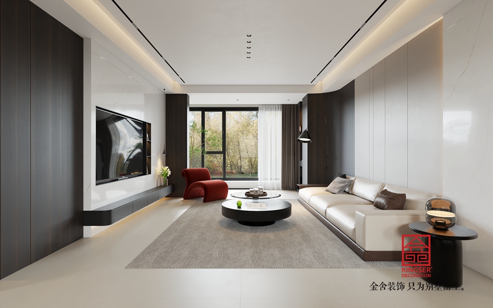 淺米色的大沙發,搭配色彩層次豐富的抱枕,為休憩提供舒適且具美感的載體。黑色圓形組合茶幾,造型簡約又不失設計感,與整體空間的利落線條相呼應。一旁的白色單人沙發,搭著紅色織物,既豐富了色彩層次,又增添了溫馨感,紅色異形休閑椅更是以亮眼色彩和獨特造型,成為空間的點睛之筆,注入藝術活力。