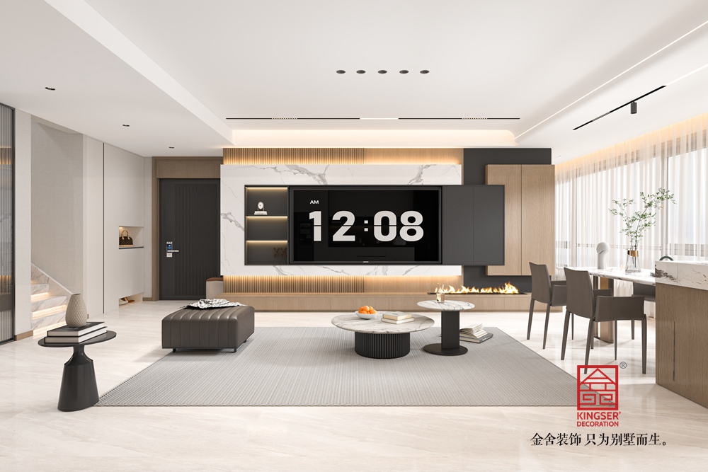 材質上融合不同質感,電視背景墻用大理石紋理提升高級感,木質線條增添溫潤氣息,淺灰色地毯則柔化地面硬度,讓空間更顯溫馨。