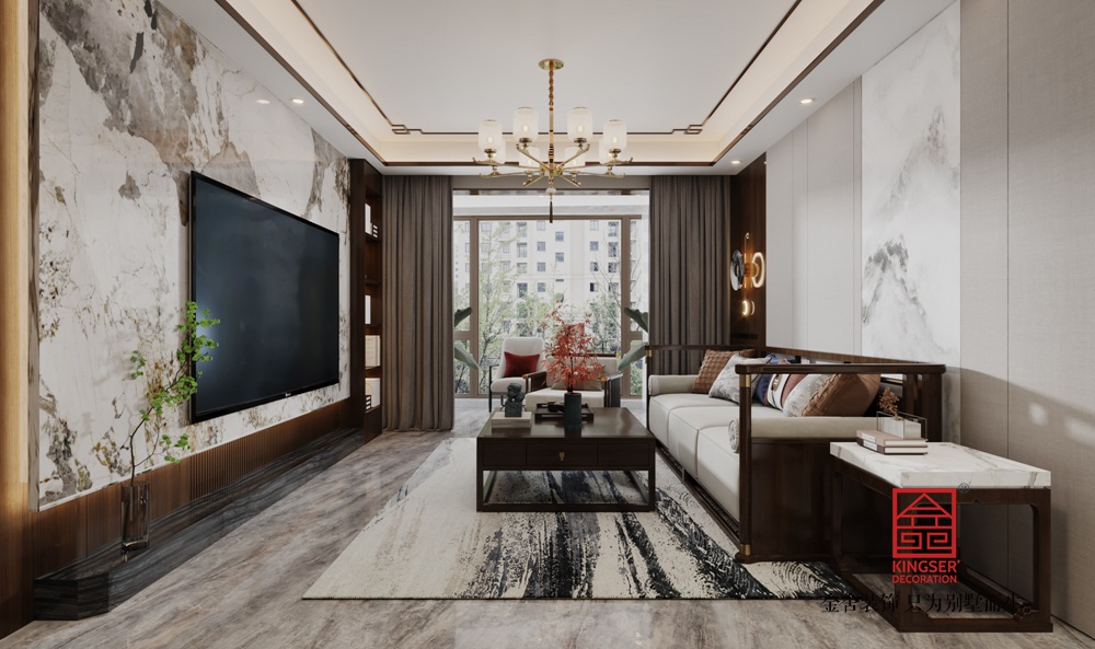 家具造型汲取中式傳統形制精髓,線條簡潔流暢,實木框架搭配軟包,既保留古樸韻味,又具現代舒適感。墻面的山水紋理裝飾、精致的中式吊燈,以及茶幾上的瓷器擺件,處處彰顯中式美學的雅致。