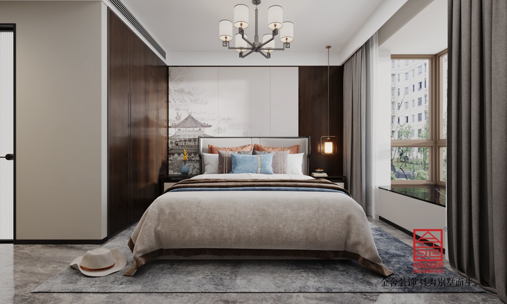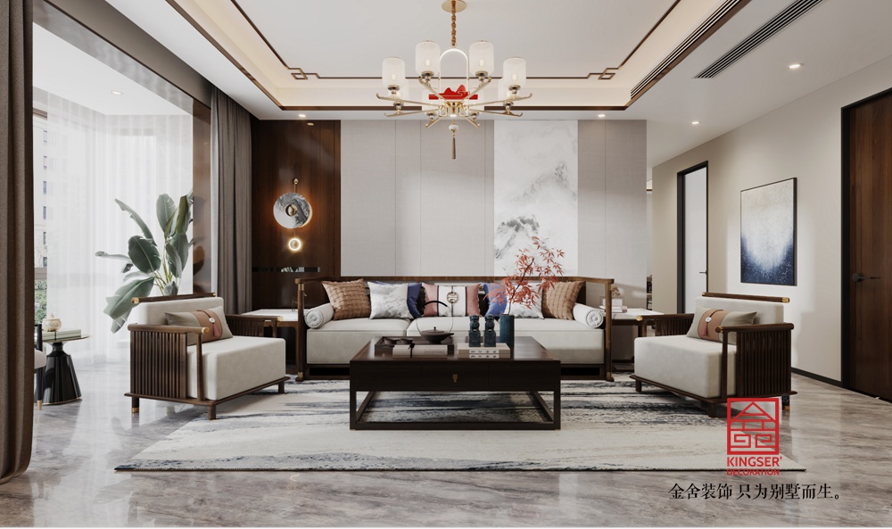 大面采光結合輕紗窗簾,讓自然光輕柔灑落,與室內的綠植、掛畫等相互映襯,營造出 “天人合一” 的意境,打造出一個既有傳統文化底蘊,又符合現代生活需求的舒適居所。