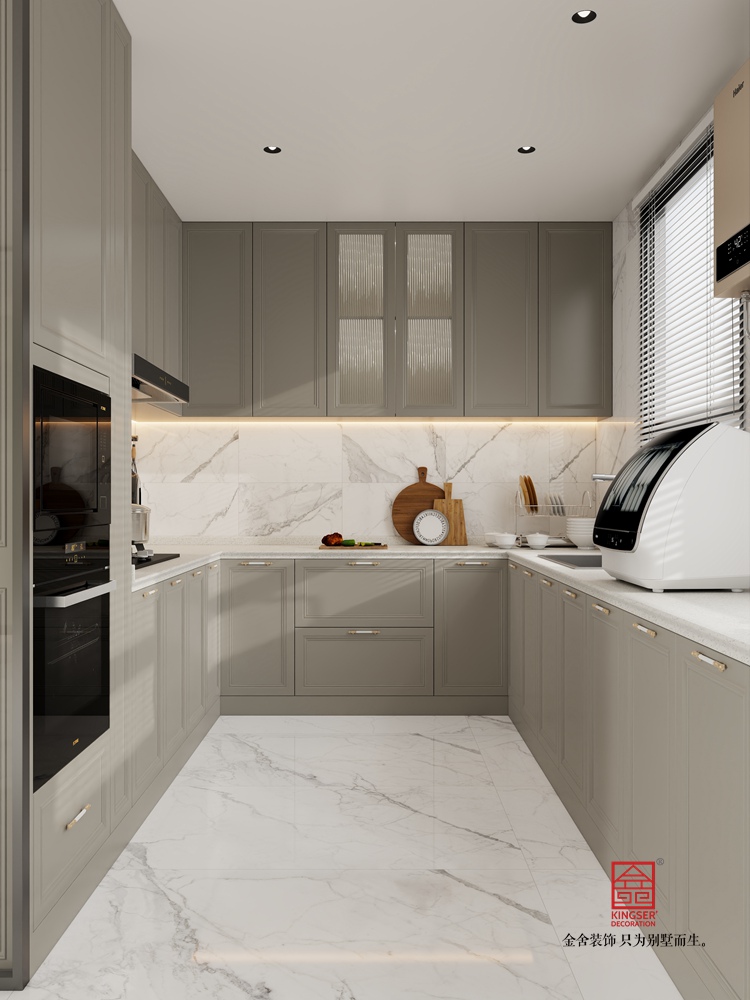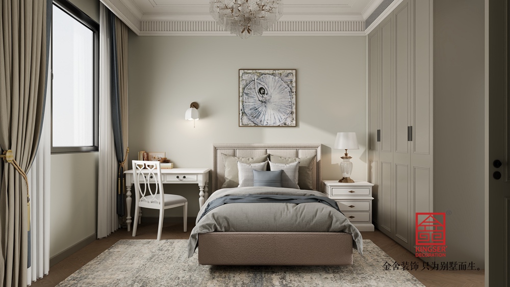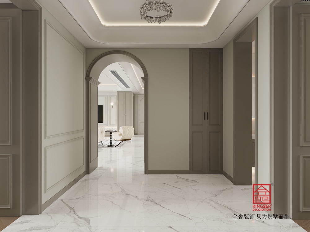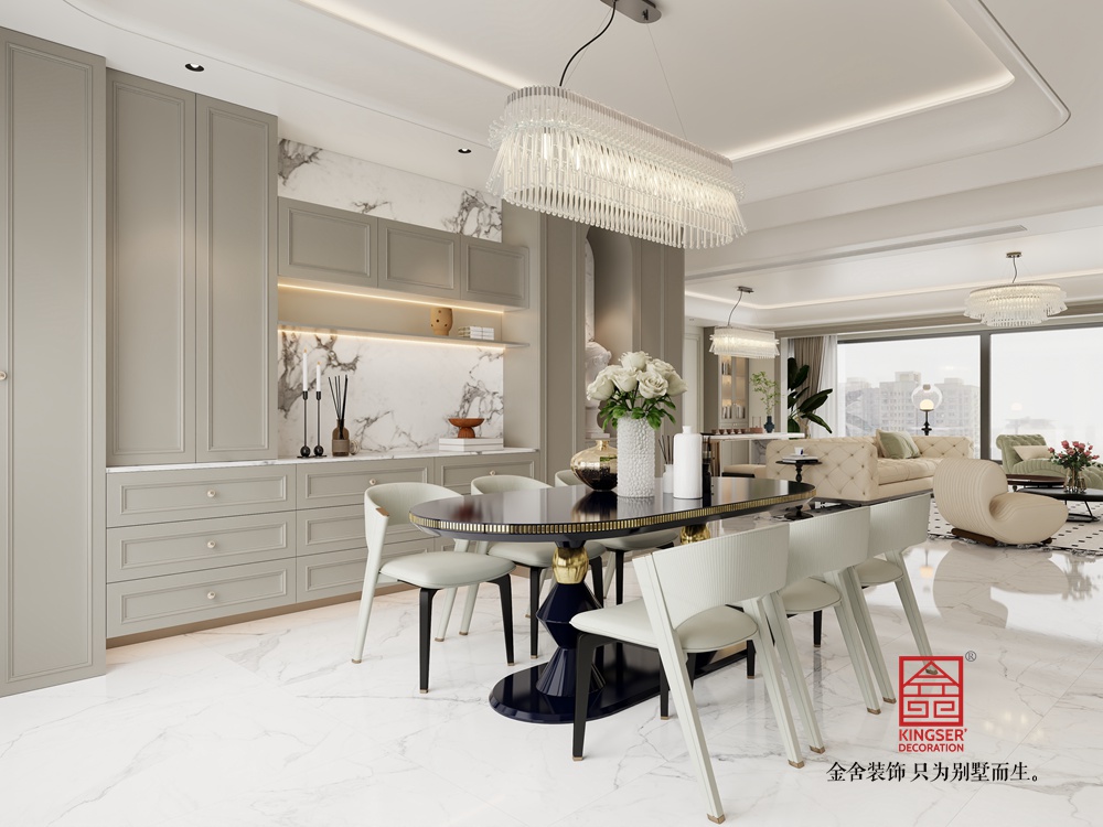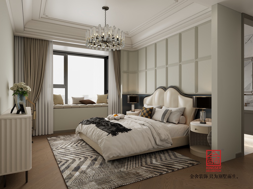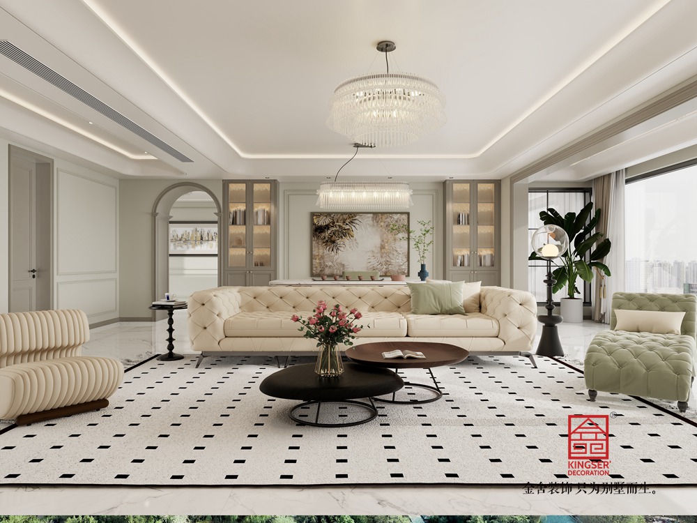地面黑白幾何圖案地毯,為空間增添時尚與秩序感,成為視覺亮點。整體布局合理,各區域過渡自然,在滿足功能需求的同時,盡顯高雅輕奢的設計美學。