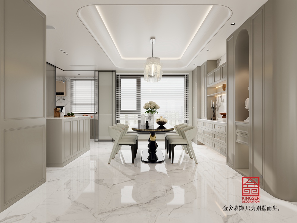 此客廳設計主打現代輕奢風,以簡潔明快的線條和柔和色調構建空間基底。大面積的落地窗引入充足自然光線,搭配淺色系窗簾,讓室內通透明亮,同時借窗外城市景致延伸視覺。